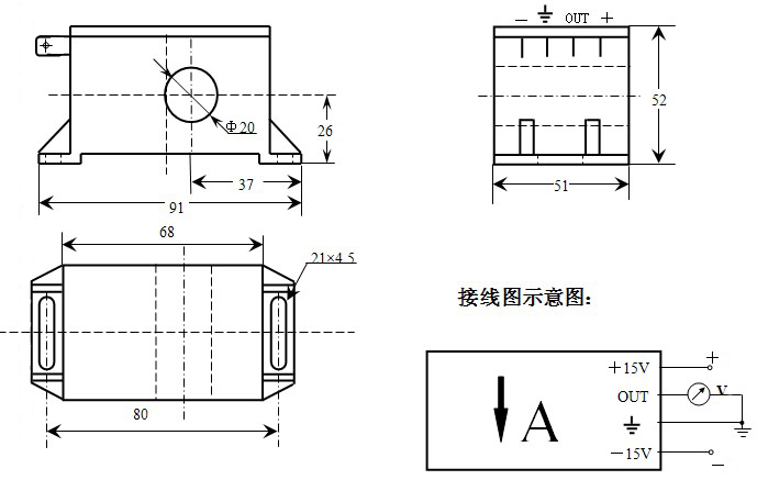 穿孔型小(xiǎo)電(diàn)流傳感器(qì)(KT-A/PJ)外形尺寸圖